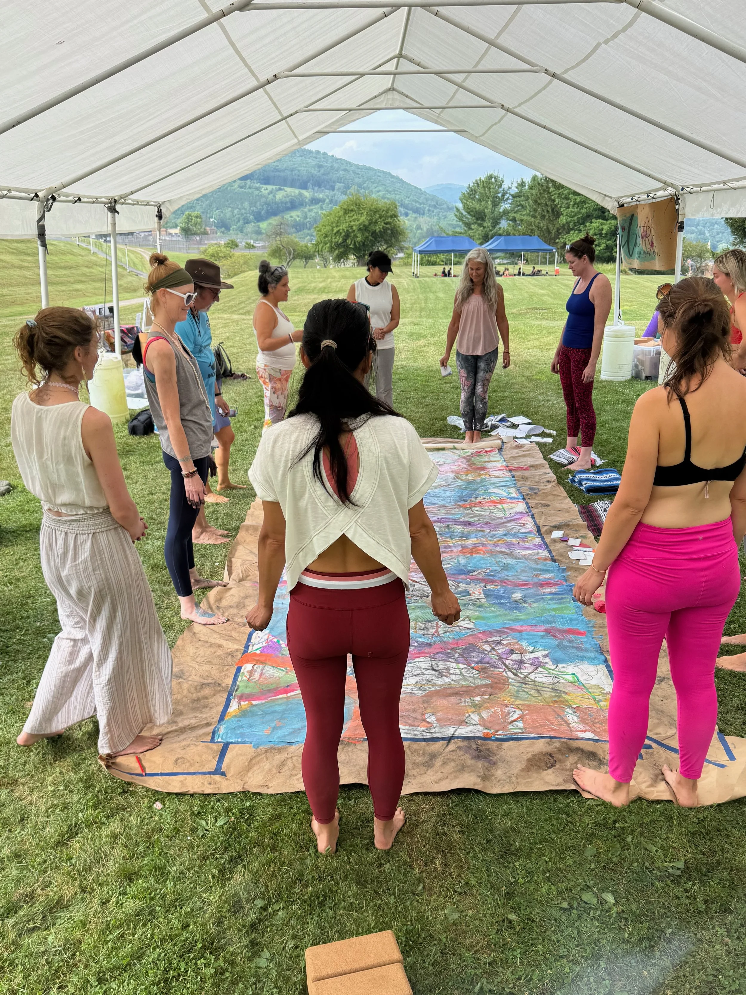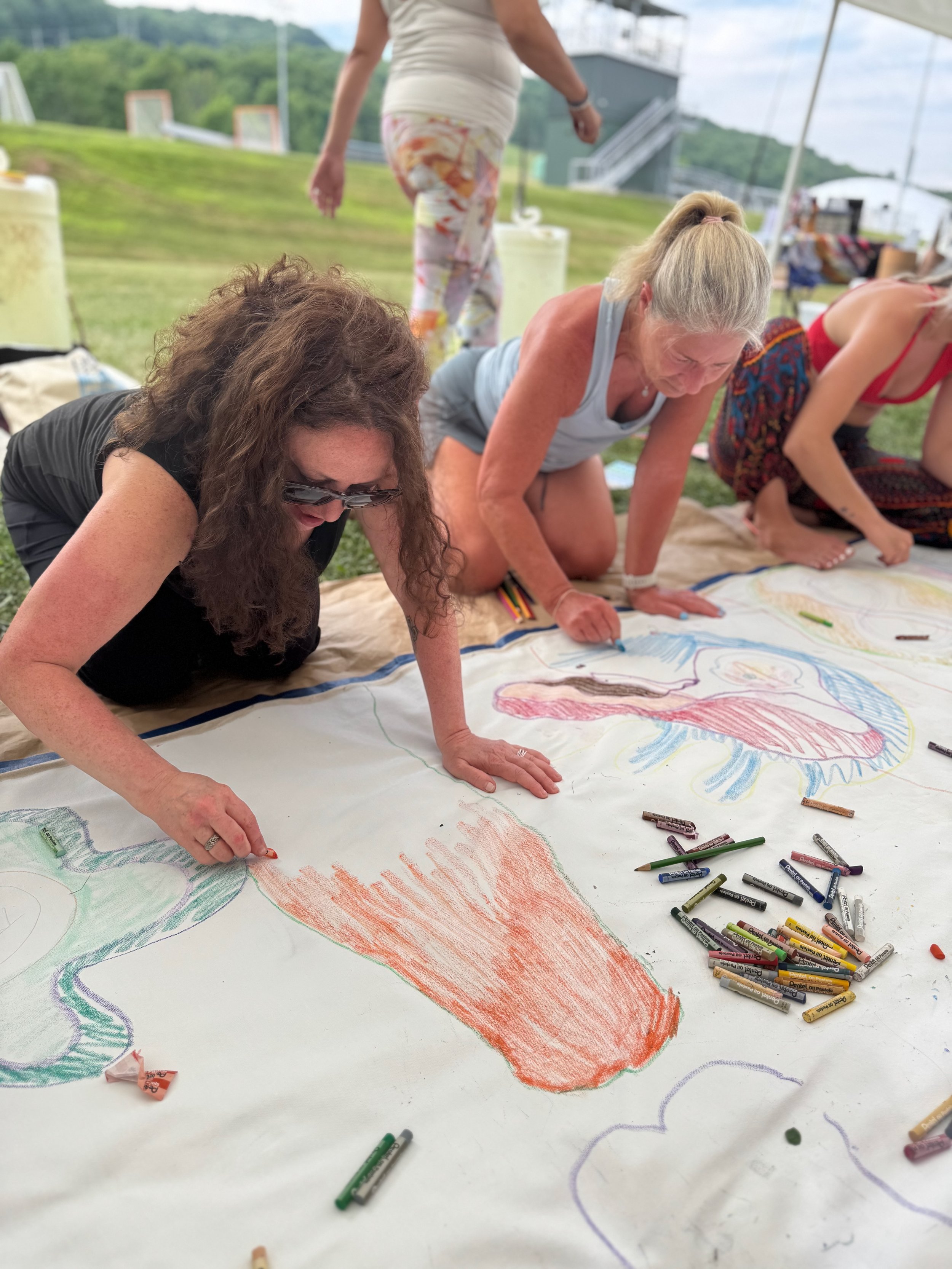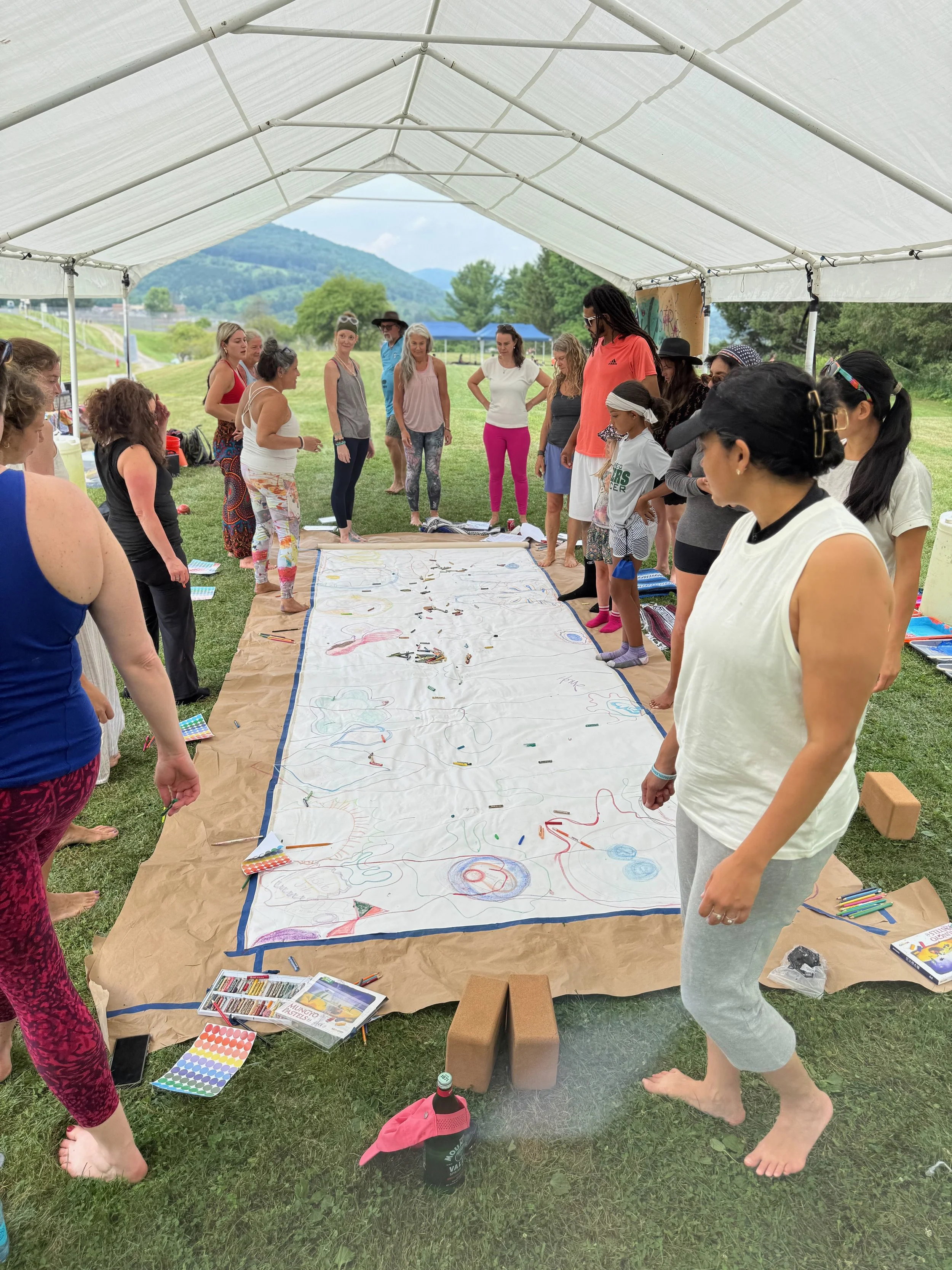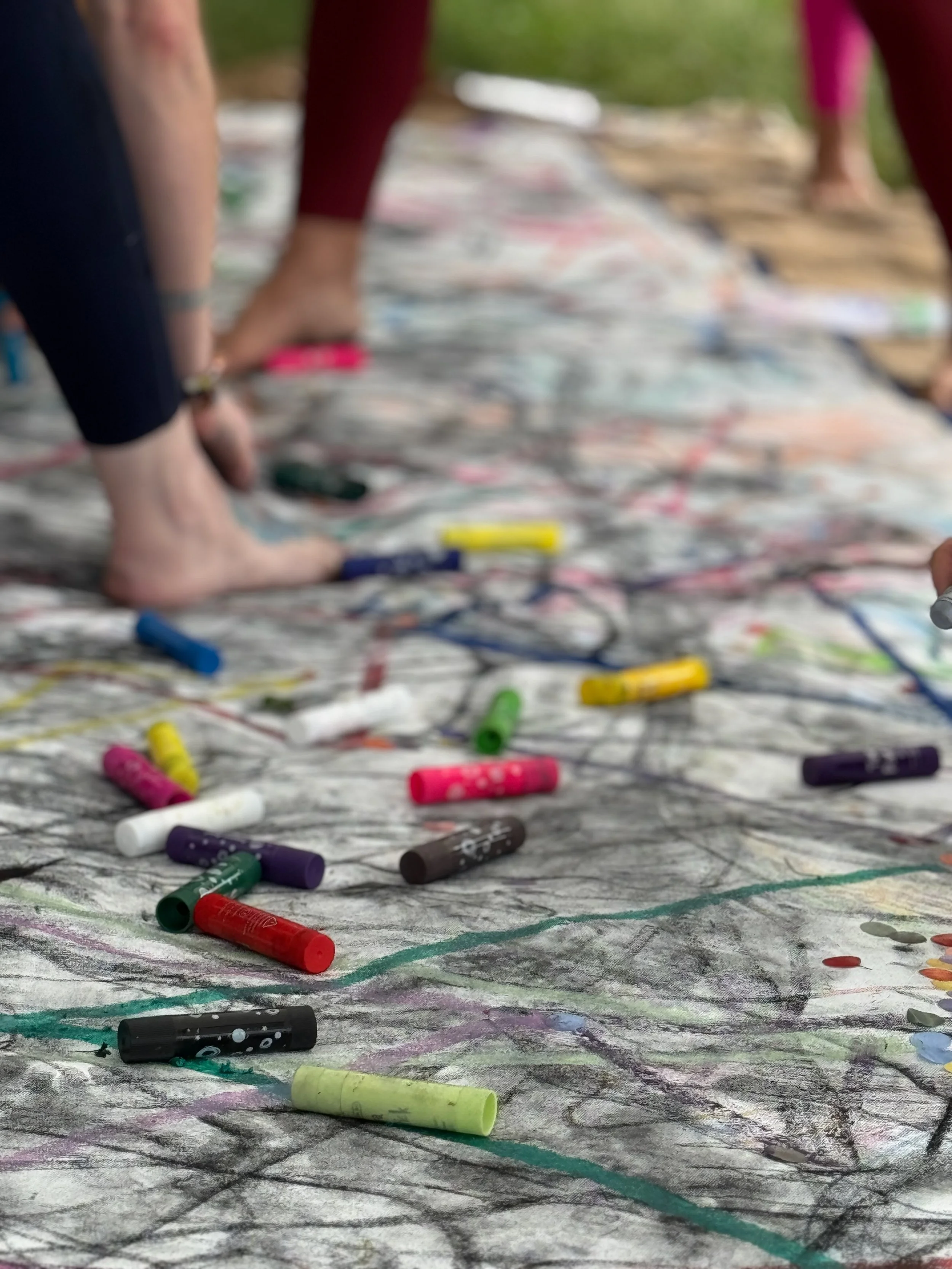 During this Heartful Yoga Collaborative Art Making session, the themes of belonging, becoming, returning and releasing were at the intersection of artmaking and yoga. This collective was guided and encouraged to explore their mark making and expressiveness without attaching to the preconceived notions of where we were going next and achieving perfection. We stepped into the present state of collective consciousness because of collective play drawing upon mindfulness, movement and mediums used at hand.