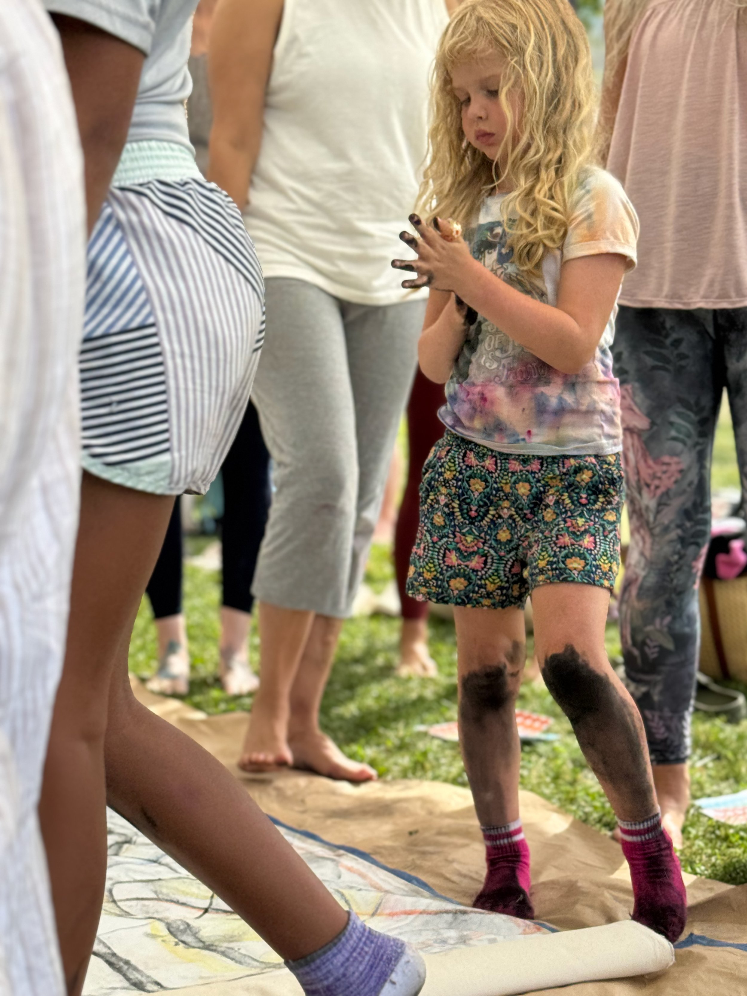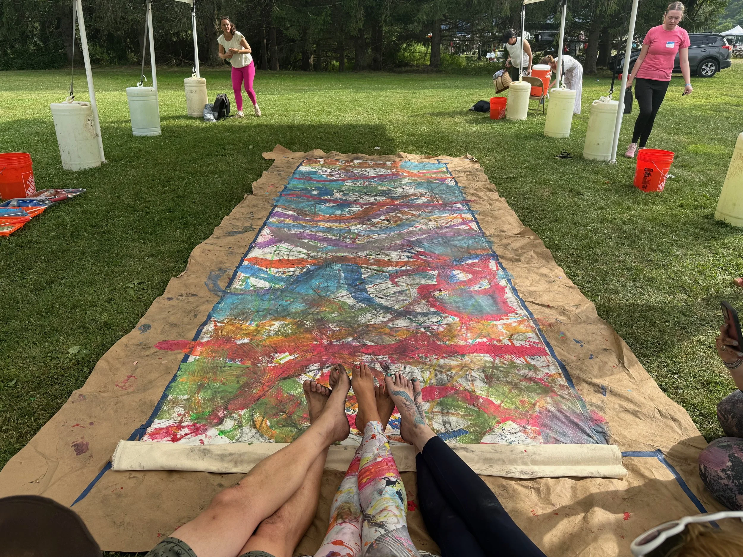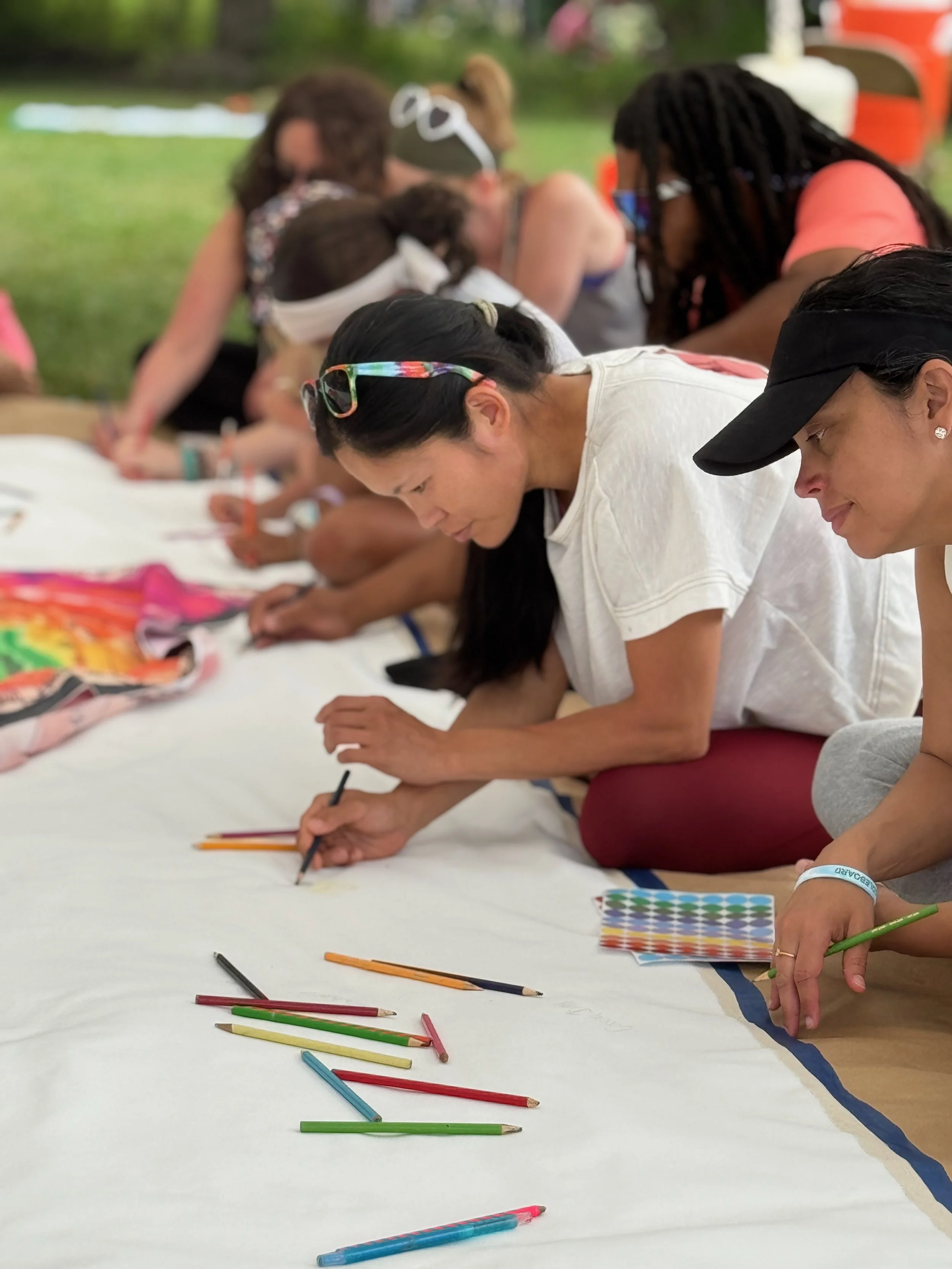 During this Heartful Yoga Collaborative Art Making session, the themes of belonging, becoming, returning and releasing were at the intersection of artmaking and yoga. This collective was guided and encouraged to explore their mark making and expressiveness without attaching to the preconceived notions of where we were going next and achieving perfection. We stepped into the present state of collective consciousness because of collective play drawing upon mindfulness, movement and mediums used at hand.