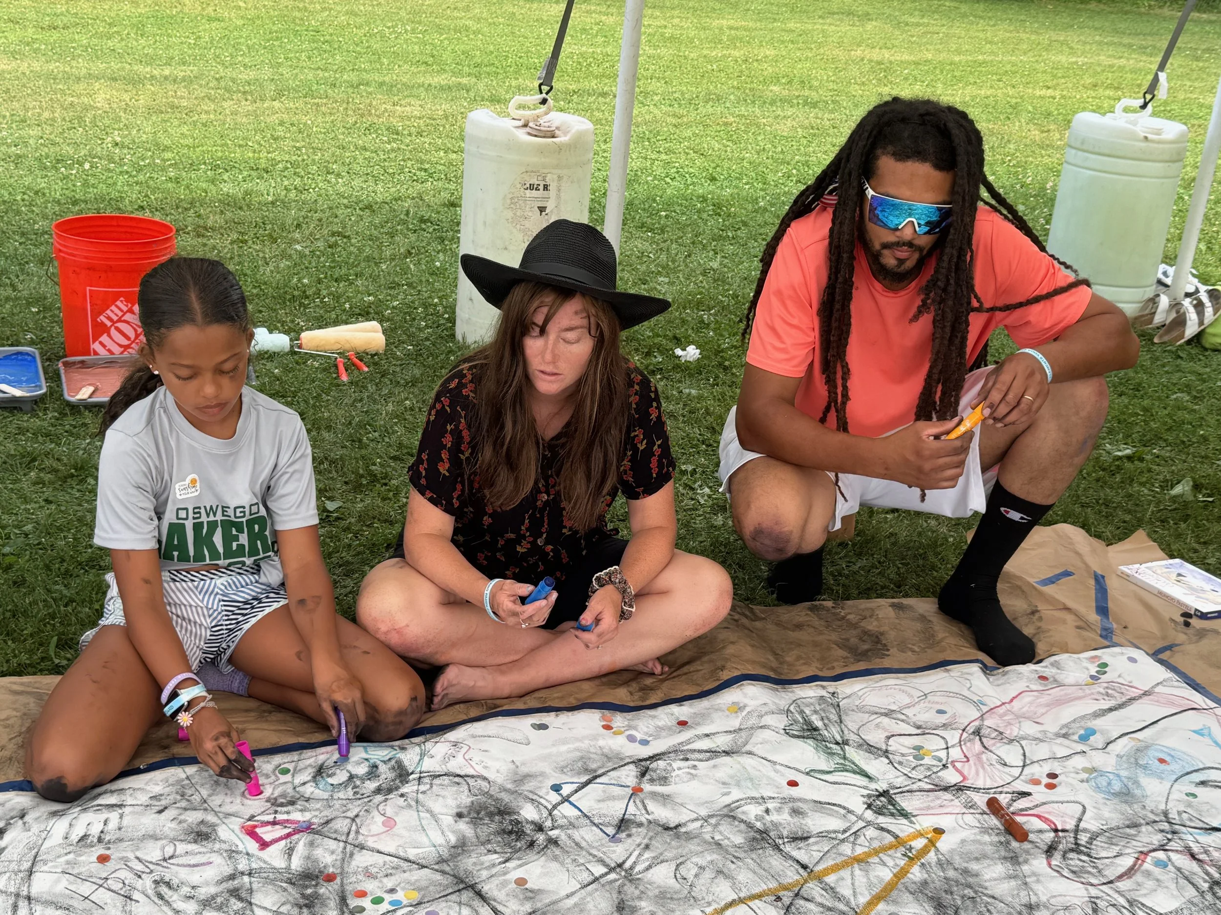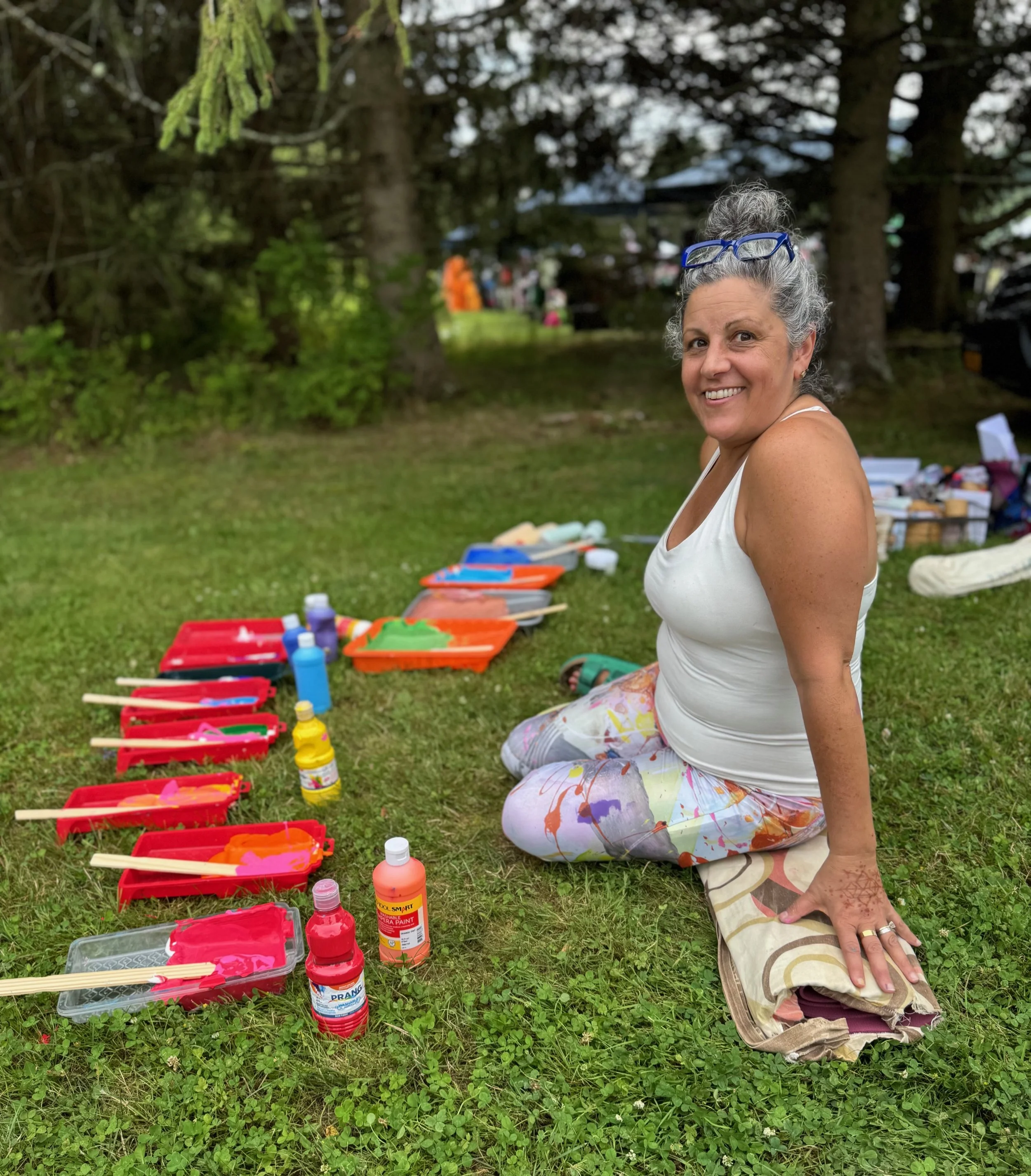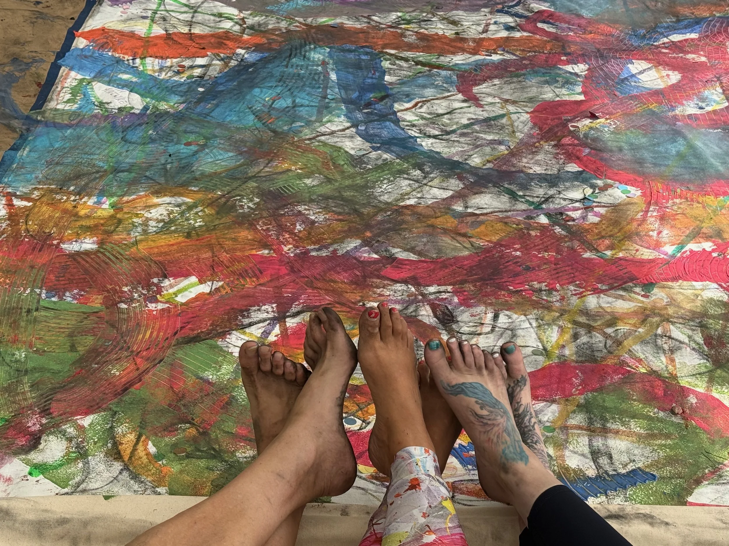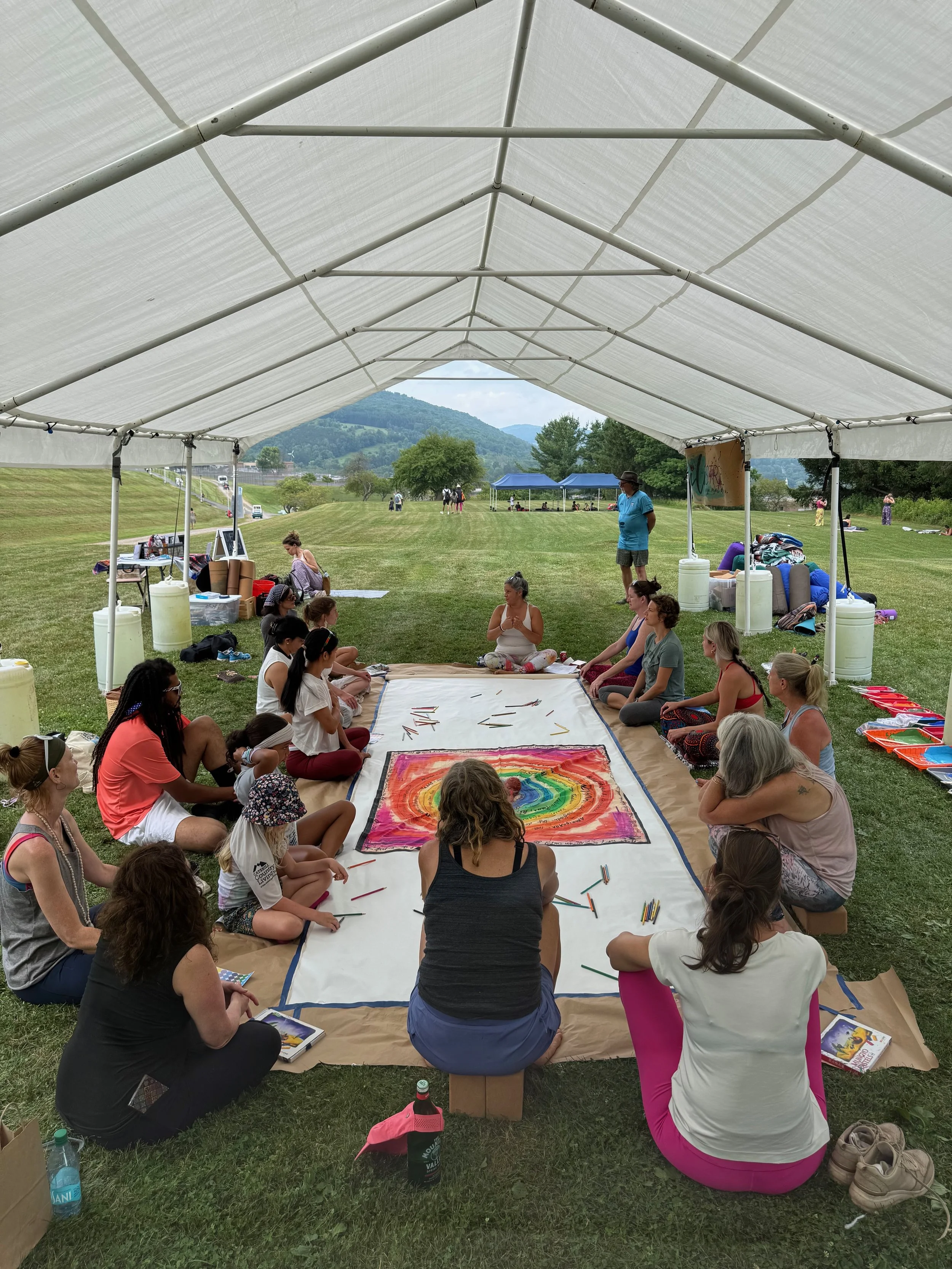 During this Heartful Yoga Collaborative Art Making session, the themes of belonging, becoming, returning and releasing were at the intersection of artmaking and yoga. This collective was guided and encouraged to explore their mark making and expressiveness without attaching to the preconceived notions of where we were going next and achieving perfection. We stepped into the present state of collective consciousness because of collective play drawing upon mindfulness, movement and mediums used at hand.
